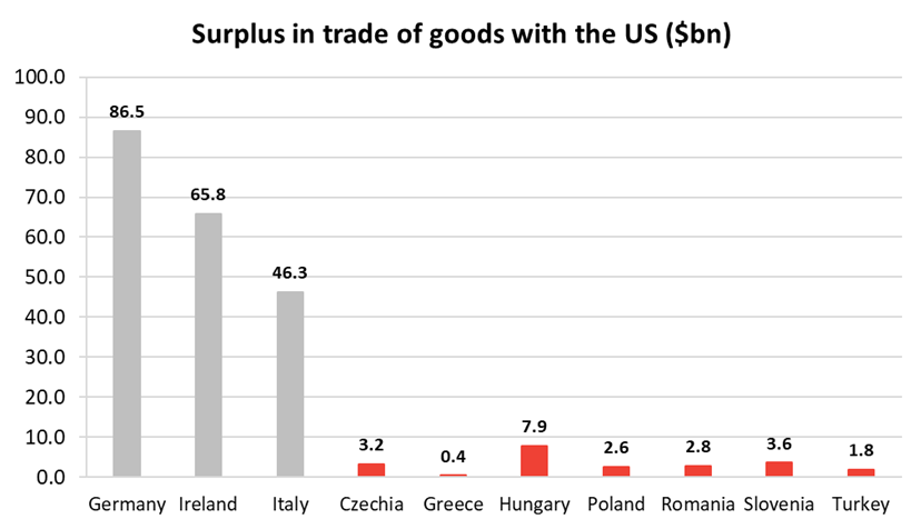 Looking at the trade balance of goods, the US had trade deficit in goods with the EU over $200bn in 2023. Almost all of it can be attributed to Germany, Ireland and Italy. At the same time the trade balances with main Emerging Europe economies were similarly in deficit but significantly smaller in absolute terms. In relation to the overall trade (exports and imports) the trade deficits, or surpluses when looking from the perspective of European countries, Germany-Ireland-Italy had a surplus of 45% of total goods trade while Emerging Europe countries had a surplus of 23%.