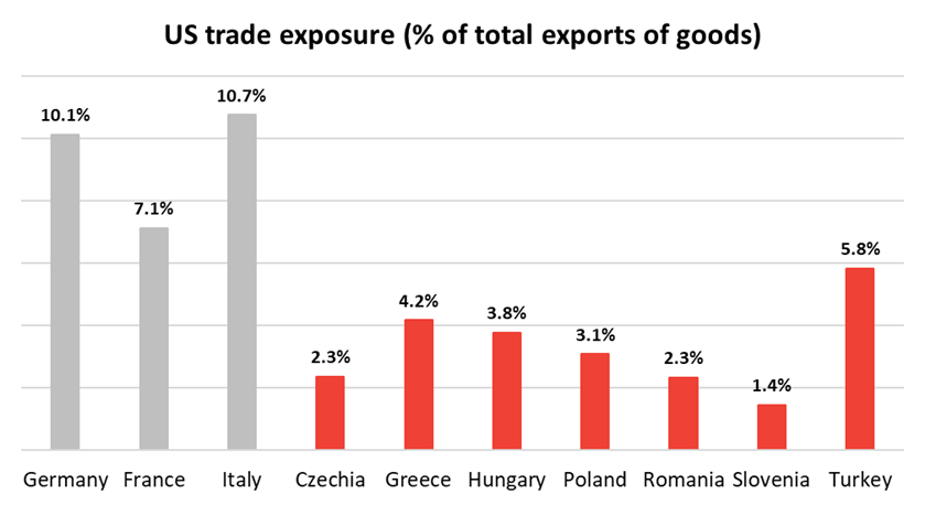 While the mentioned Emerging Europe economies may not have substantial direct trade with the US, their deep integration into Western European supply chains makes them vulnerable to indirect effects. Many regional countries serve as crucial links in the manufacturing networks of Western Europe, especially Germany. For instance, components produced in Poland or Czechia are often exported to Germany for final assembly before being shipped to the US. If the U.S. imposes tariffs on European goods, it could disrupt these supply chains, leading to reduced demand for intermediate goods from Emerging Europe countries.